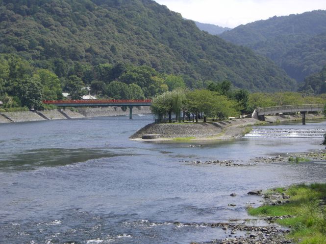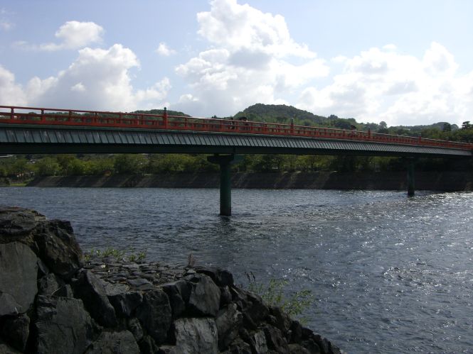 宇治橋から上流に歩き宇治神社の赤い鳥居が見えると、宇治川の右岸から橘島に渡る「朝霧橋」がある。