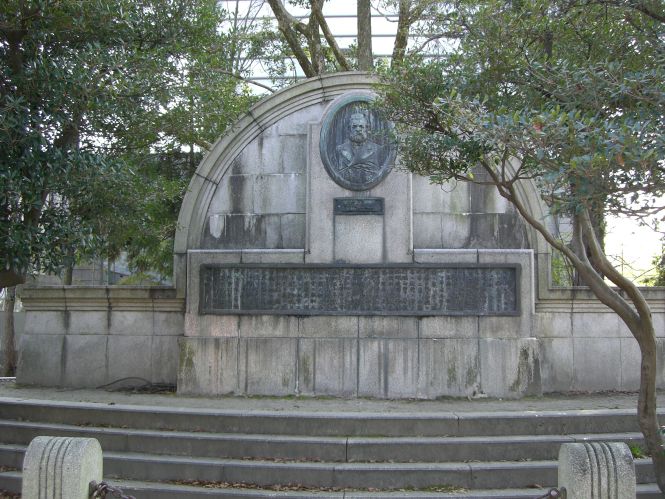 是に至て市民益々君の功徳を思ひ遂に遺容を鋳て貞石に嵌し之を会場の一隅に建つ。