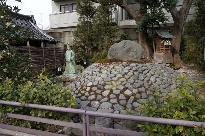 久志塚の傍らの像は、彫刻家江里敏明氏による「吉川観方先生小直衣像」で、櫛まつりに幾多の御協力をいただきました報恩のあかしとして昭和54年9月15日に安置し、ご功績を明記いたしております。』