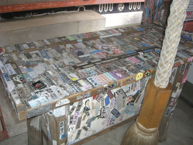 本殿の柱といわず鳥居や賽銭箱にまで、もう貼れないというほどの名札や写真などが貼られている。