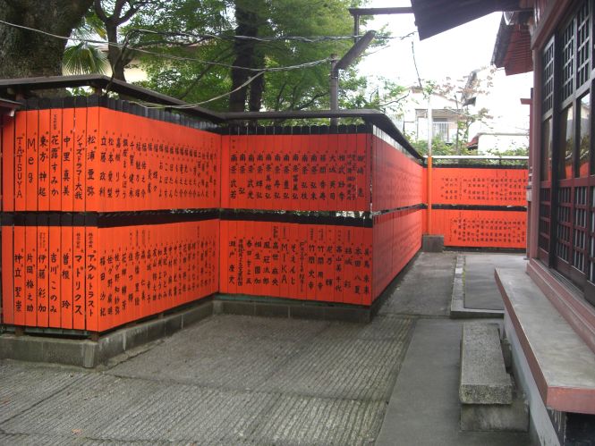 芸能神社は、芸能・芸術の分野で活躍する人たちに厚い信仰があり、芸名などを記した朱塗りの玉垣が2,000枚以上も奉納されている。