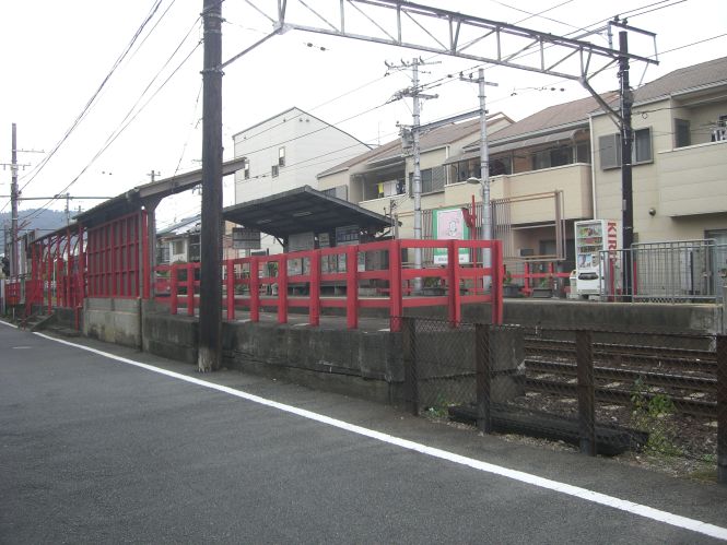 車折神社に因んで、駅の柵や柱は朱色に塗られている。