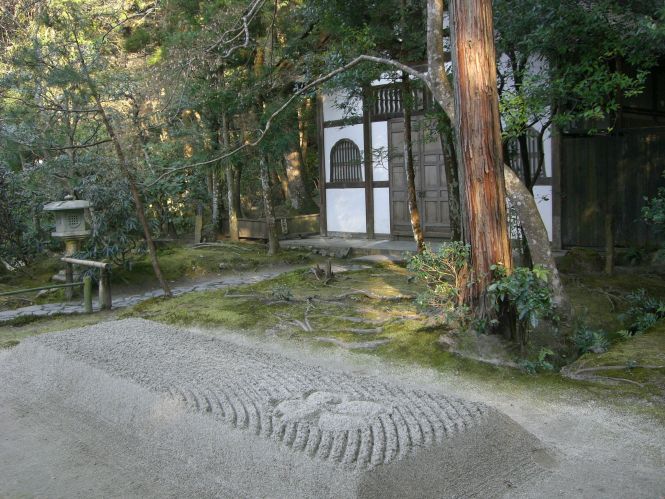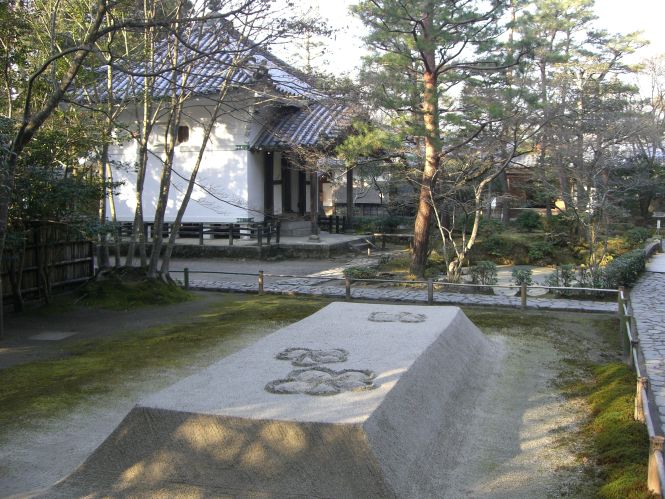 その山門を中に入ると、あっと云う景色に出会う。両側に盛砂という、左右形の違う砂絵が目に入る。