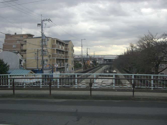 師団橋から見た北側で、左側に鉄柱が並んでいるのが、京阪電車の本線(大阪と京都をむすぶ)である。上が京都方面となる。