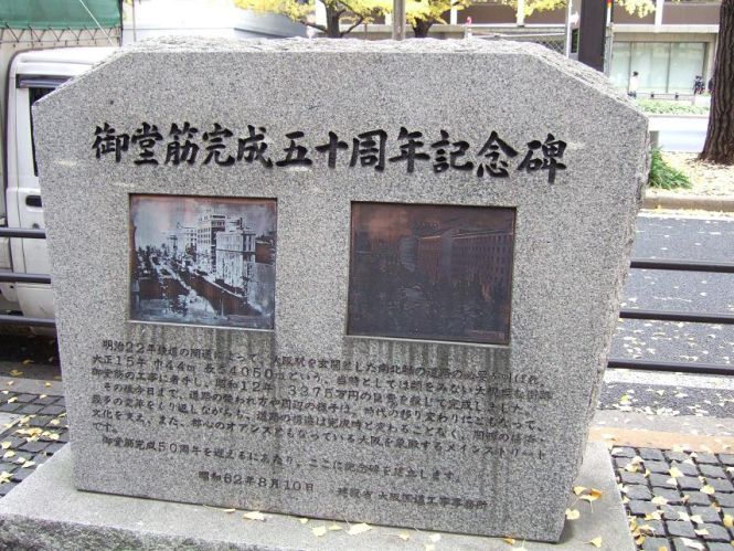途中に、完成50周年の碑が建っていて、昭和62年に五十周年とあるから、昭和12年に御堂筋が出来たことになる。