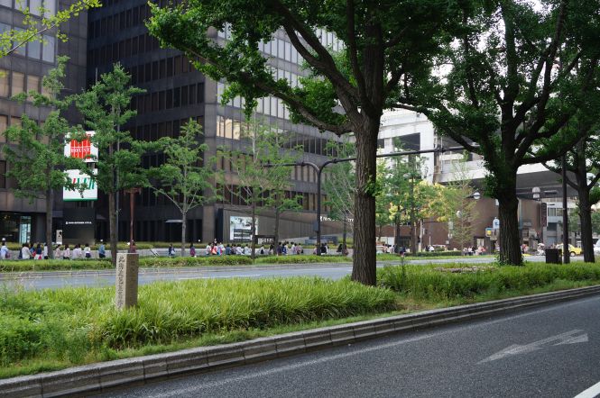 その跡を示す「此附近芭蕉翁終焉ノ地ト傳」の石碑が、御堂筋の分離帯の中に建っている。
