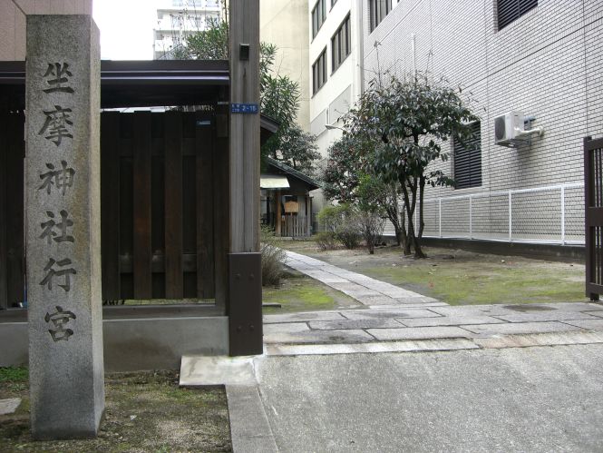 熊野街道の石碑から土佐堀通を西に、ひとつ目の筋を南に曲がると坐摩神社行宮(いかすりじんじゃあんぐう)がある。