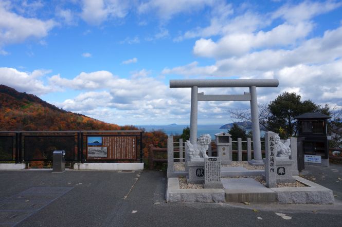 『遥拝所の鳥居の先のかなたに浮かぶ二つの島が冠島沓島です。