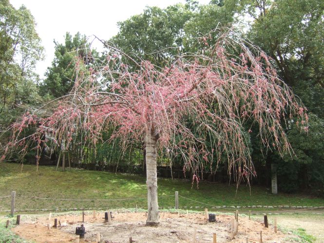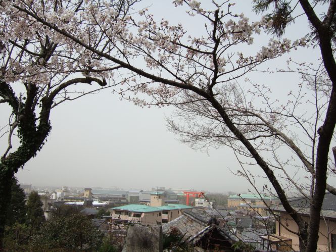 そこを登りつめ社殿の桜を愛でて後、ふと振り返えってみると、平安神宮の赤い大鳥居が目に入った。前にも振り返ってこの赤い鳥居が見えたのだが、今日は、桜の花越しに平安神宮の赤い鳥居を見ることが出来た。