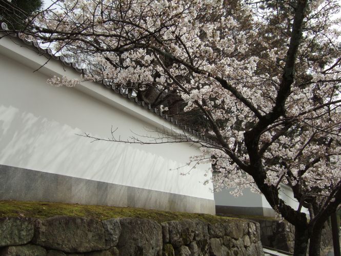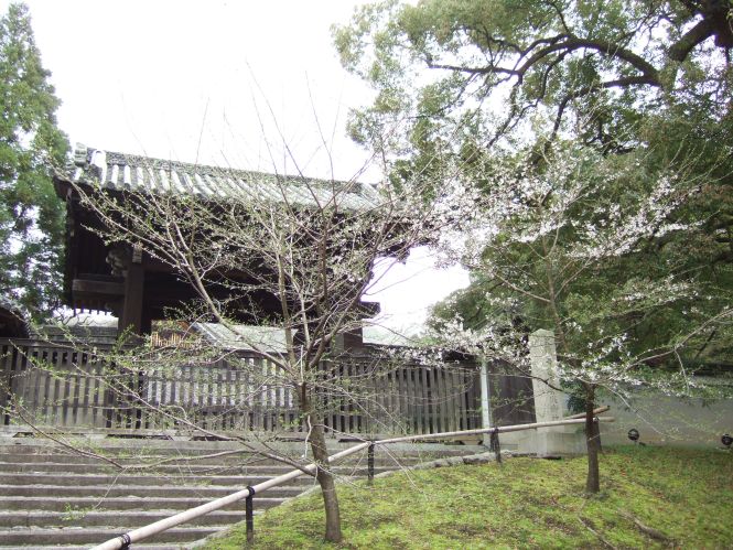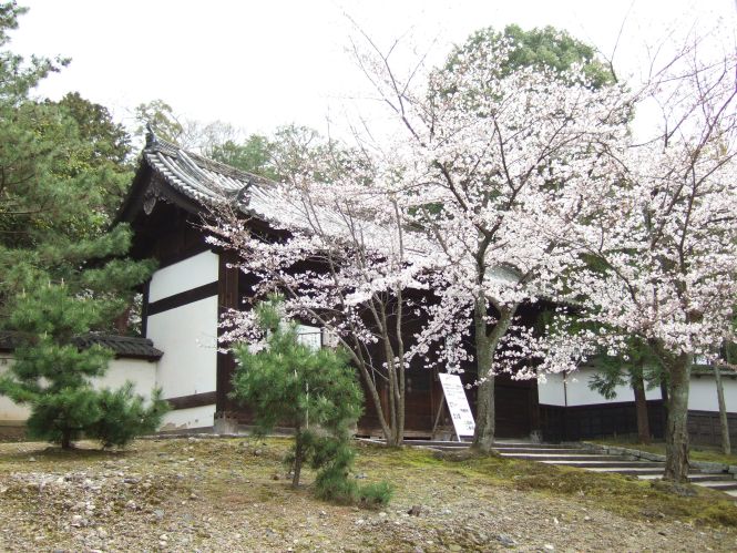 その門の前に咲いていた桜の花と小御所の建物を見ることが出来る。