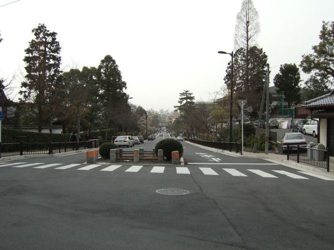 京都駅から知恩院へくるのは、100系統のバスに乗って東山の麓を走るのり、調度、下に見える鳥居のところが東大路通りで、そこの知恩院前のバス停でおり、この鳥居を抜けて登って来ると知恩院にたどり着くことになる。