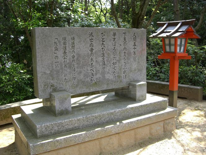 「人間五十年、下天の内をくらぶれば 夢まぼろしの如くなり ひとたび生を得て、滅せぬ者のあるべきか」とその一節を謡い、桶狭間の今川の大軍に立ち向かう。